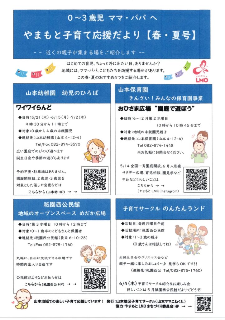 やまもとLMO構成団体、山本地区子育てサークルが中心となり、山本幼稚園、山本保育園、祇園西公民館の4団体で、0~3歳児の親子さんにむけて、「やまもと子育て応援だより【春・夏号】」作成してみました。ぜひ、親子であそびに来てみてください。