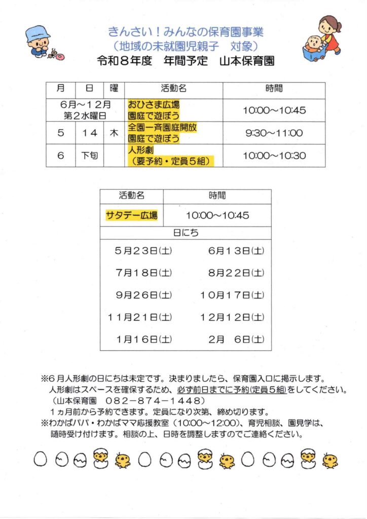 また、詳しい日程などについては、山本幼稚園、祇園西公民館は、それぞれのホームページからご覧になってください。